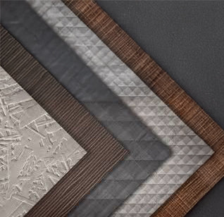 This range of texture-rich three dimensional veneers have been embossed with a series of geometric decorative designs. This production technique creates a visually impactful, tactile veneer, with all the properties of natural wood from which it is constructed. The muted, earthy colour palette reflects some of the dyed products from the wider Tabu veneer range.